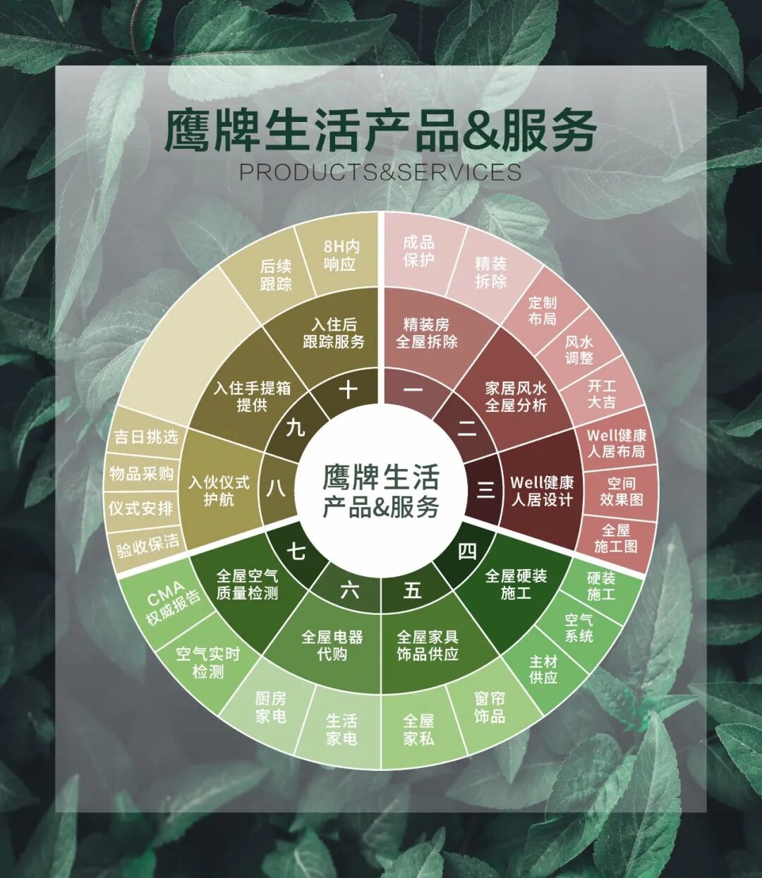 鹰牌生活,作为健康家居领域的领航者,始终坚守初心,秉持“健康家居一站式服务”的品牌理念,致力于为消费者打造理想的家居生活。为了深化这一理念,鹰牌生活精心布局,构建了全方位、全周期的健康家居一站式服务体系。这一体系不仅覆盖了从精装房全屋拆除到入住后的持续关怀的每一个环节,更从WELL健康人居设计、材料选择、施工安装、后期维护等多个维度,全方位、深层次地关照人的身心健康需求。